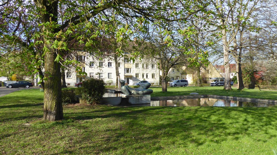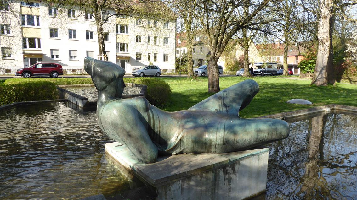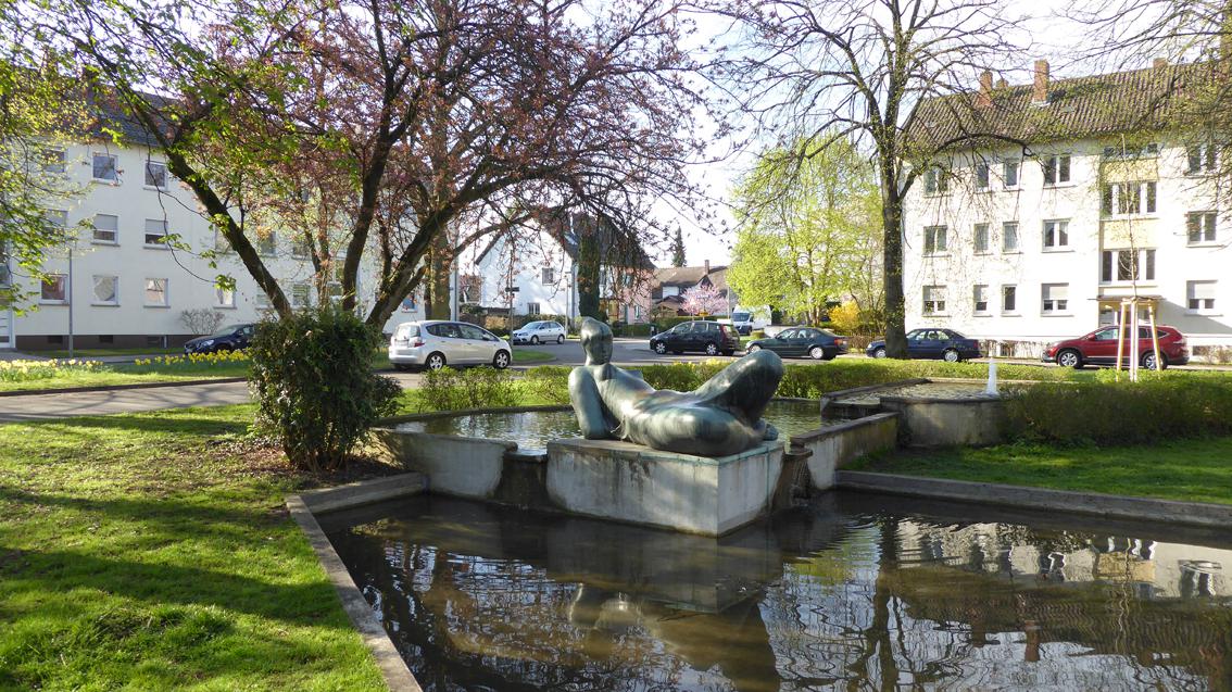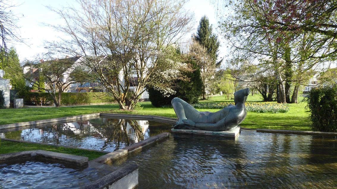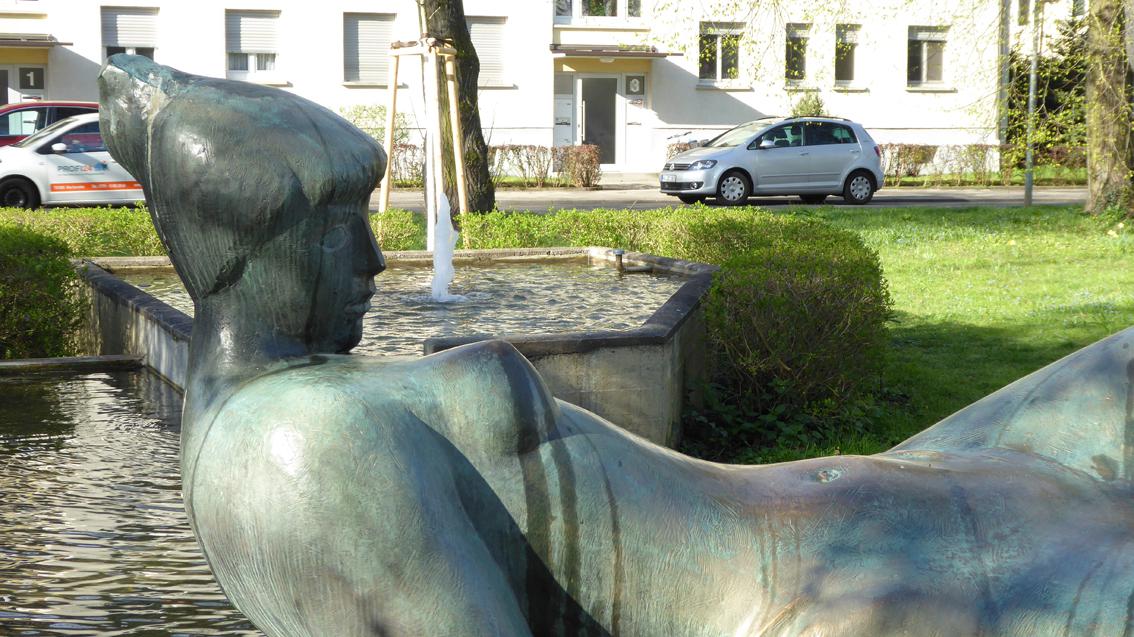 Für seine ca. 15 m auf 18 m große Brunnenanlage in Rüppurr erhielt der Künstler im Jahre 1957 den Kunstpreis der Stadt Karlsruhe für Bildhauerei und Plastik. Der bronzene, figürliche Teil der Anlage steht in der Tradition der Menschendarstellung von Christoph Voll. Die ‚Liegende‘ von Hans Graef (1909-1963) gibt sich allerdings formal und inhaltlich gewagter, verglichen mit ähnlichen Motiven seines Lehrers. Der Bronzeguss wurde von der Gießerei Strassacker in Süssen ausgeführt.