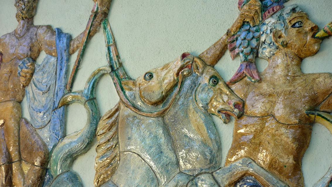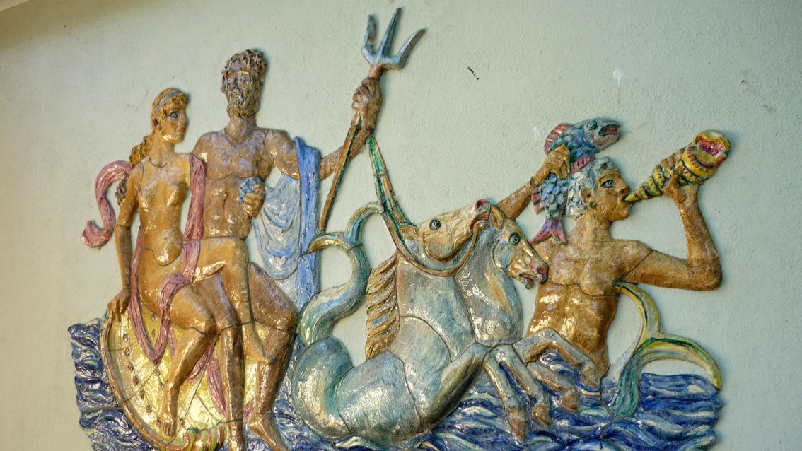Neptun ist der römische Gott der fließenden Gewässer. Hier lässt er sich in Begleitung einer schönen Frau von zwei Mischwesen - halb Pferd, halb Fisch – durch das blaue Wasser ziehen. Eine weitere, männliche Figur gibt die Richtung vor. Das gut erhaltene, keramische Wandbild ist ein Werk des Bildhauers und Keramikers Carl Egler, der in Karlsruhe mehrfach vertreten ist. Es entstand in enger Zusammenarbeit mit der Staatlichen Majolika Manufaktur Karlsruhe.