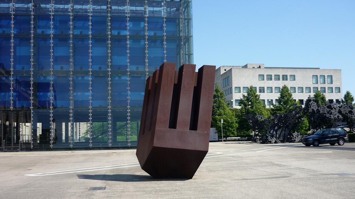 Werner Pokorny ist einer der renommiertesten Stahlbildhauer Deutschlands. Er lehrte als Hochschullehrer in Karlsruhe und Stuttgart. In einer elementaren Formensprache und vorwiegend in Cortenstahl ausgeführt, umkreist der Künstler das Motiv ‚Haus‘. Der Titel der Arbeit auf dem Vorplatz des ZKM betont die nach oben ausgerichteten Pfeiler eines auf dem Dach liegenden Hauses. Zugleich himmelwärts ausgerichtet und umgestürzt daliegend, umgibt das Kunstwerk eine beunruhigende Spannung. Werner Pokorny verstarb am 31. Dezember 2022.