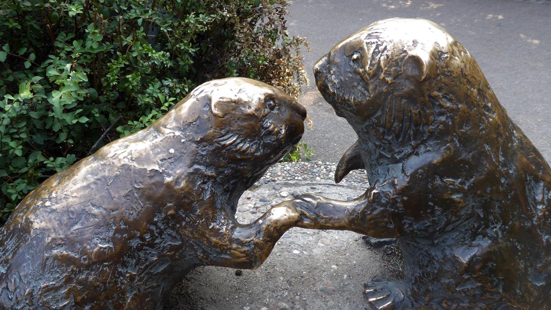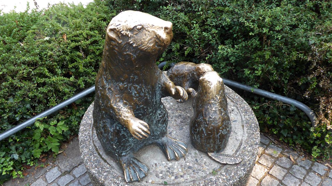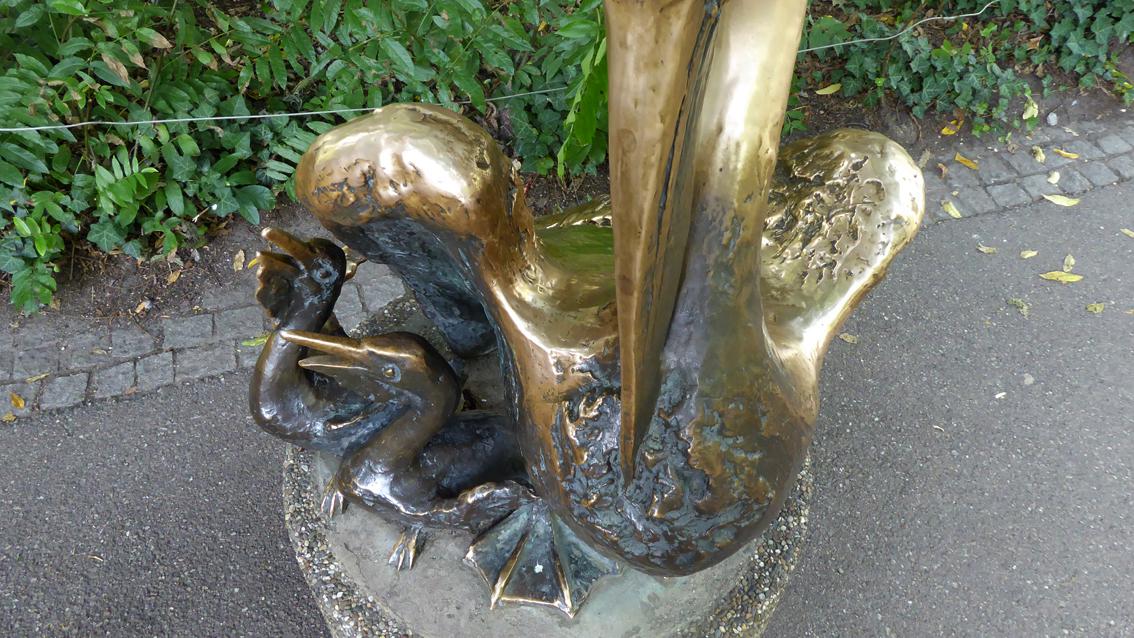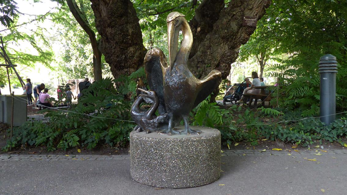 Die Künstlerin spezialisierte sich in den 70er Jahren des letzten Jahrhunderts auf die Fertigung von Tierplastiken. So gehörten zu ihren Auftraggebern in erster Linie Zoologische Gärten. Vor allem die Pelikangruppe überzeugt durch ausdrucksstarke Formgebung und dynamische Komposition. Fast magisch zieht sie vorwiegend Kinder an. Die beiden Tiergruppen stehen auf runden Steinsockeln zwischen dem Giraffengehege und Affenhaus.