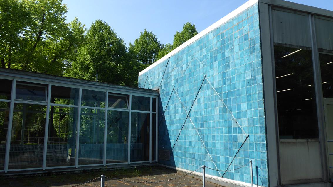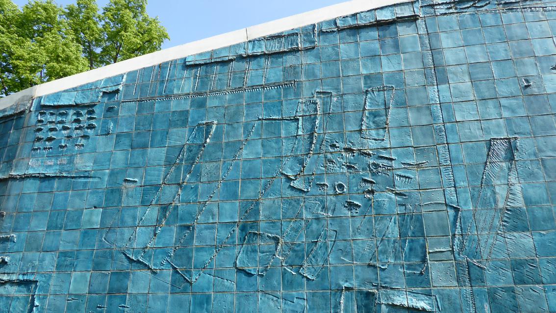 Der Künstler war einer der bekanntesten Professoren an der Staatlichen Akademie der Bildenden Künste Karlsruhe. Anfang der 60er Jahre des letzten Jahrhunderts entwarf Georg Meistermann Reliefs für die Außenwände des Hörsaals am Institut für Technische Thermodynamik und Kältetechnik am KIT. In Zusammenarbeit mit der Staatlichen Majolika Manufaktur Karlsruhe entstanden unterschiedlich gestaltete Kacheln in Blau, die den geschlossenen Gebäudekomplex sichtbar auflockern.