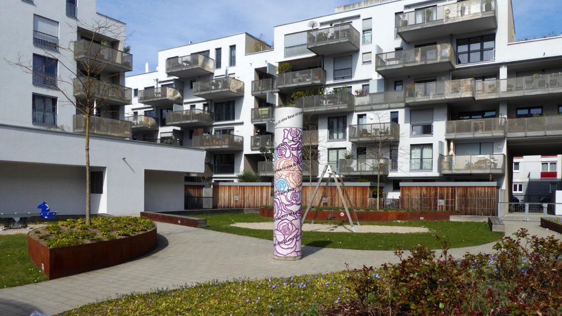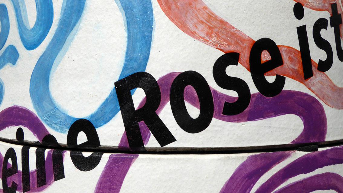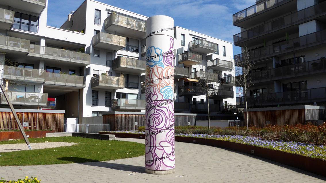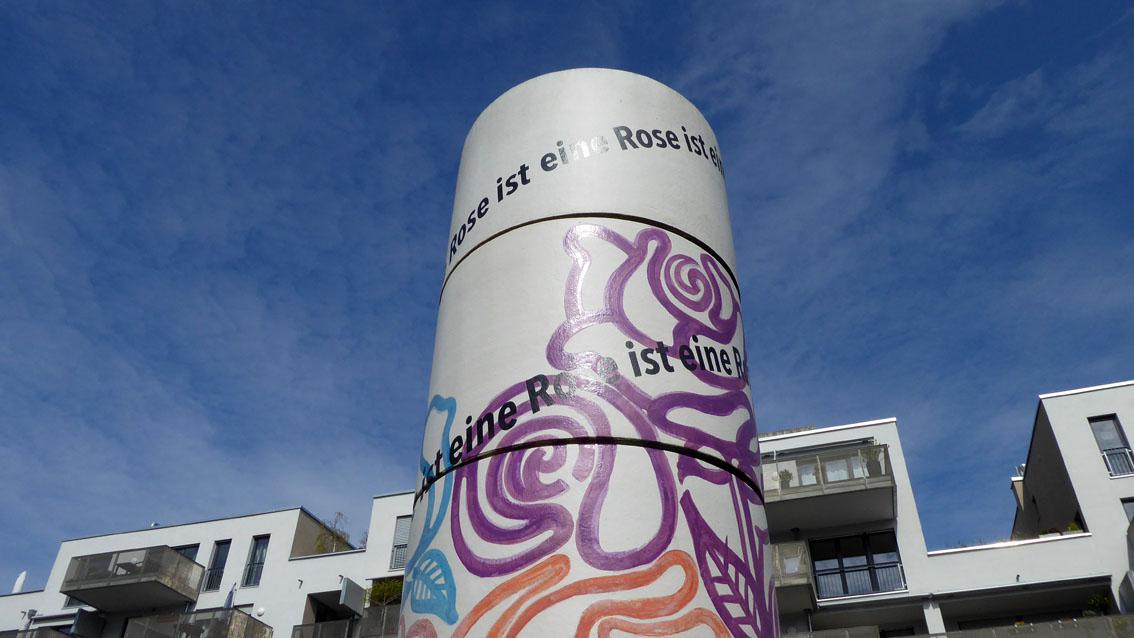 Die Keramikerin, die seit langem mit der Staatlichen Majolika Manufaktur Karlsruhe verbunden ist, stellte im Jahre 2013 ihre Stele im Rosengarten-Carré in der Südoststadt auf. Sie besteht aus sieben Teilformen, die sich zu einer ca. 3,5 m hohen Säule fügen. Wachstum und Blütenform der Rose sind als Linienzeichnung in Blau, Orange und Violett vereinfacht wiedergegeben. Ergänzt werden die mäandernden, farbigen Bewegungsspuren durch die berühmteste Aussage der amerikanischen Schriftstellerin und Kunstsammlerin Gertrude Stein: ‚Eine Rose ist eine Rose ist eine Rose ist eine Rose‘.