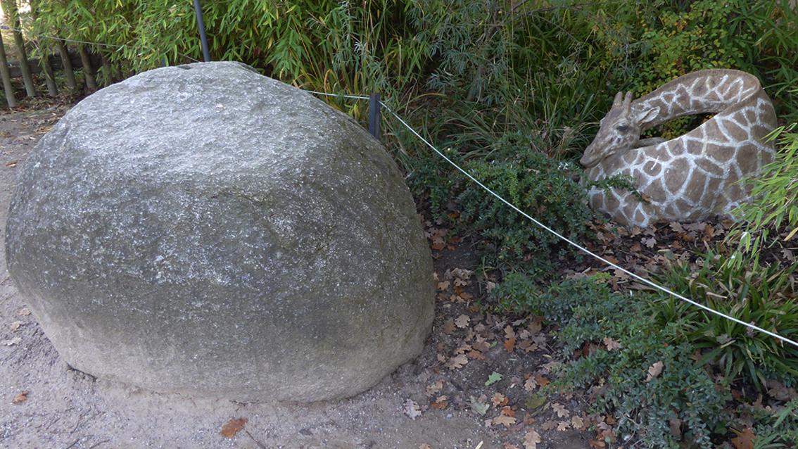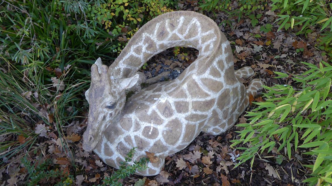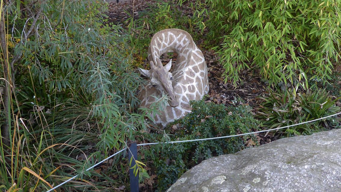 Vor dem Giraffenhaus hat die Ettlinger Künstlerin Irmela Maier eine Tierplastik installiert. Sie wurde im Rahmen eines Wettbewerbs ausgewählt und in der Staatlichen Majolika Manufaktur Karlsruhe gefertigt. Das Giraffenkalb ist wirklichkeitsnah dargestellt. Es ruht im Schutze der sie umgebenden Vegetation und eines großen Steines.