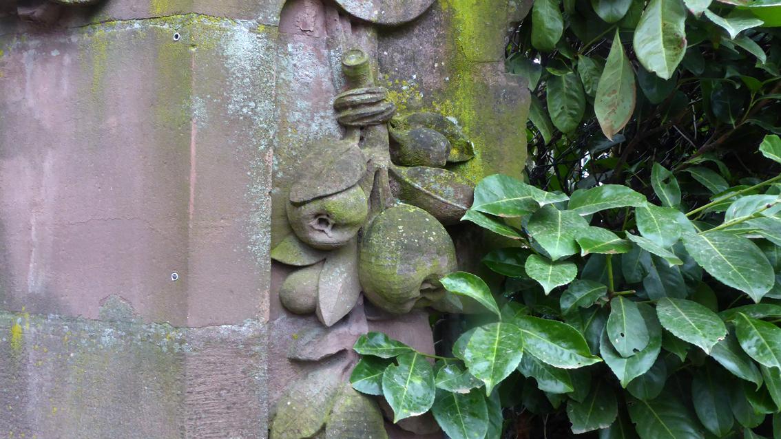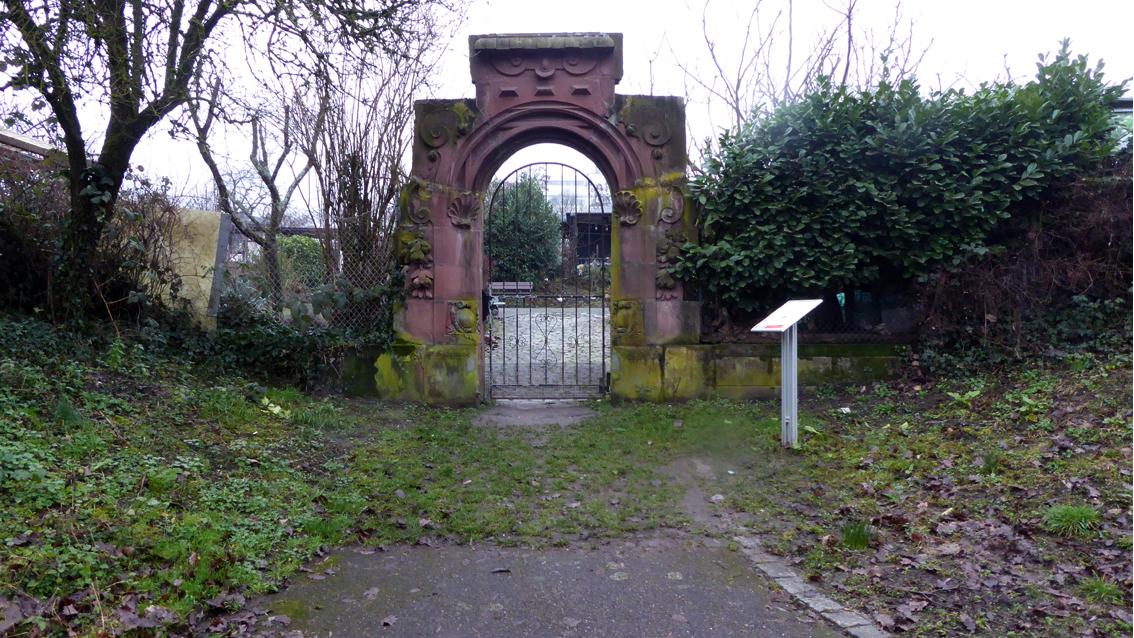 Das historische Architekturfragment verweist als markantes Zeichen aus Naturstein auf die dahinter liegende Anlage der ‚Gartenfreunde im Albgrün‘. Das Tor ist aus unregelmäßigen Quadersteinen gefügt, der Bauschmuck besteht aus Stabwerk, Muschelelementen, Früchtestillleben und Wappen mit Zierrahmen. Es ist der Epoche des Historismus zuzuordnen, als Architekten im Übergang vom 19. ins 20. Jahrhundert vorausgegangene Stilrichtungen zitierten. Vor allem die mit Moos und Flechten überzogenen Früchte erscheinen zum Greifen nah. Das Portal stammt aus dem Gaststättenkomplex ‚Kühle Krug‘, der im Jahre 1898 eröffnet worden war. Der Bauherr wollte neben einem Biergartenlokal mit Saal und Musikpavillon einen extra Gastraum haben, um die Arbeiter der naheliegenden Brauerei Sinner und der Reißwolle- sowie Spiritusfabriken in Grünwinkel zu bewirten. Planer der gastronomischen Anlage war der angesehene Architekturprofessor Carl Schäfer, der in Karlsruhe zudem die Altkatholische Kirche entwarf. Dem Architekturbüro Heinz Jakubeit ist es zu verdanken, dass das Sandsteinportal nach dem Abriss der alten Gaststätte erhalten blieb, im städtischen Bauhof zwischengelagert und im Jahre 1976 am jetzigen Standort wieder aufgerichtet wurde.