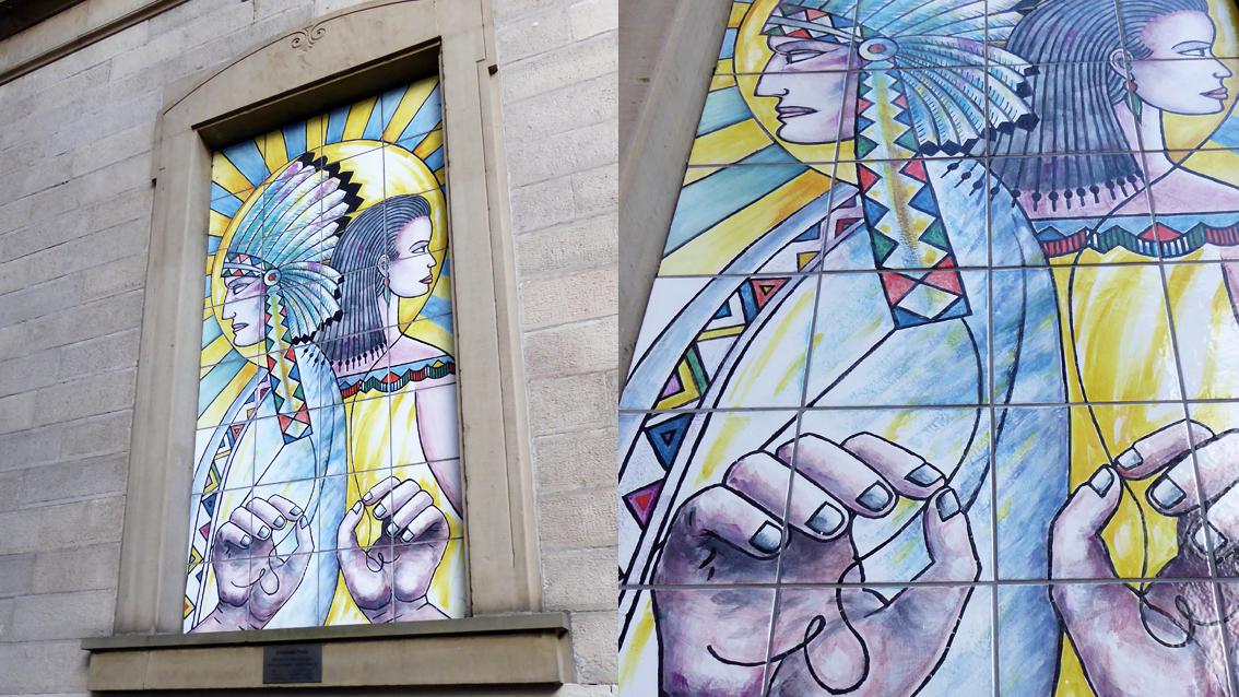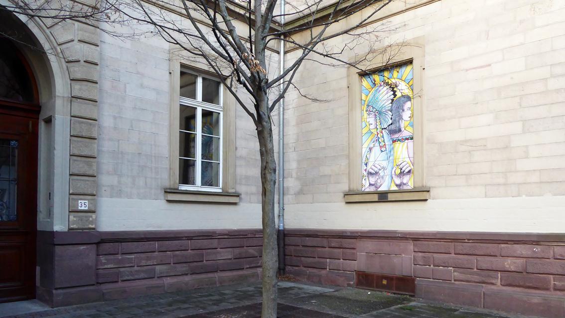 Das in der Tradition der Naiven Kunst stehende Werk entstand im Jahre 1999 nach einem Entwurf von Andrea Feuerriegel für einen Fensterausschnitt des Schulgebäudes in der Karlsruher Südstadt. Es ist getragen von einer hellen, transparenten Farbigkeit und gefügt aus gebrannten und glasierten Tonkacheln. Es zeigt vor einer stilisierten Sonne ein Indianerpärchen, die Blicke in die weite Ferne gerichtet. Zwei Hände greifen gleichsam von außen in das Bildgeschehen ein, indem sie an Fäden ziehen, die Sonne, Frau und Mann untereinander verbinden.