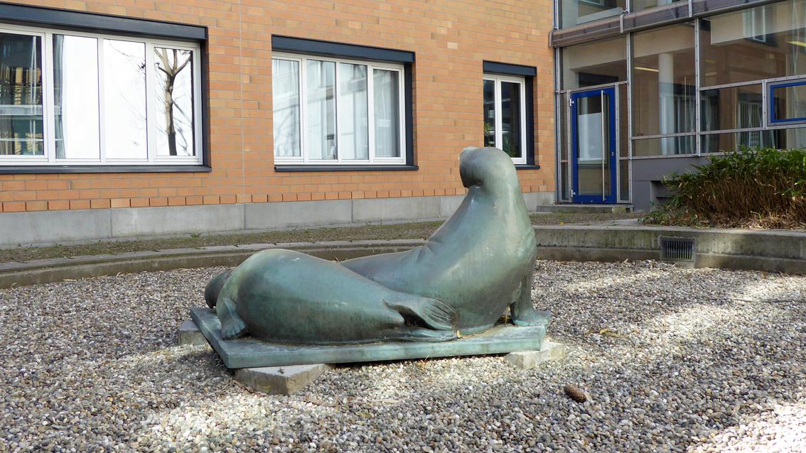 Hans Graef war Bildhauer und Lyriker. Er wurde 1909 in Freiburg geboren und starb ebenda im Jahre 1963. Er studierte Bildhauerei bei Christoph Voll an der Landeskunstschule, der Vorläufereinrichtung der Staatlichen Akademie der Bildenden Künste Karlsruhe. Das Seelöwenpaar, das sich heute im Innenhof der Agentur für Arbeit in der Brauerstraße befindet, zitiert die Formensprache der Bildhauerei der 50er Jahre des letzten Jahrhunderts: Die Wirklichkeit erscheint vereinfacht und leicht abstrahiert dargestellt.