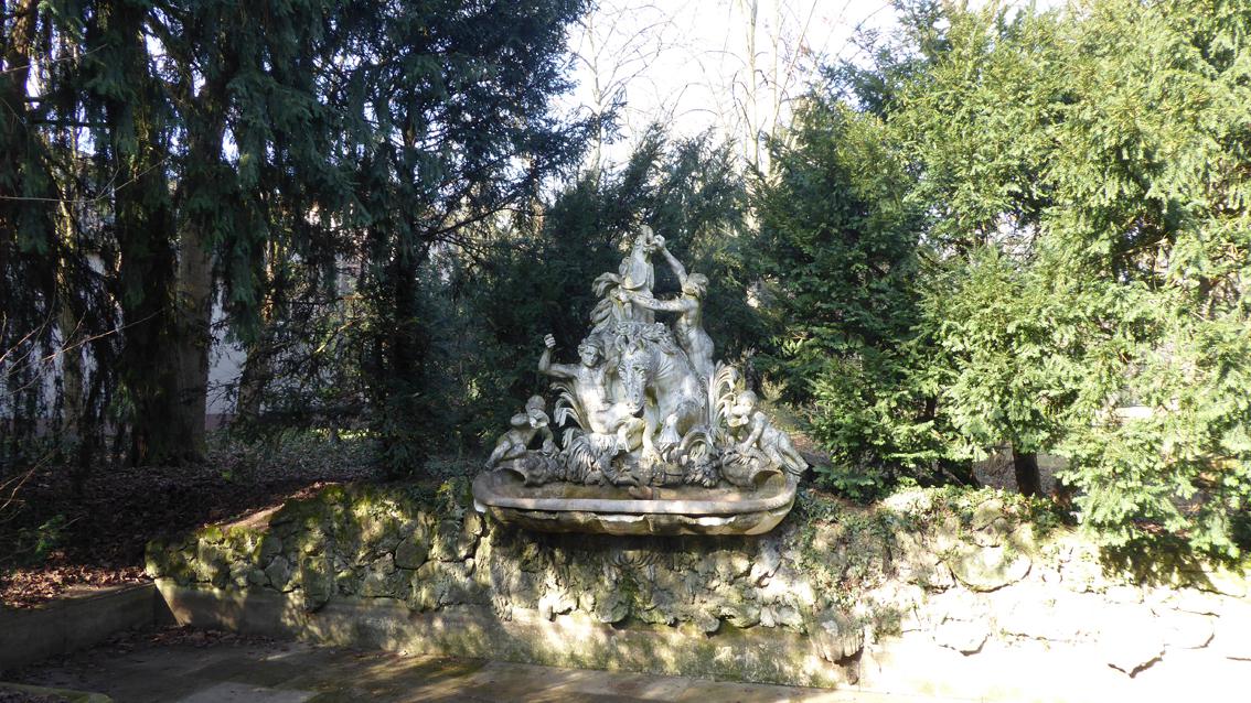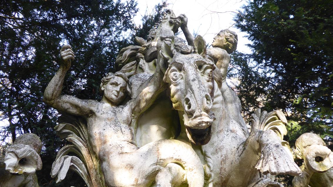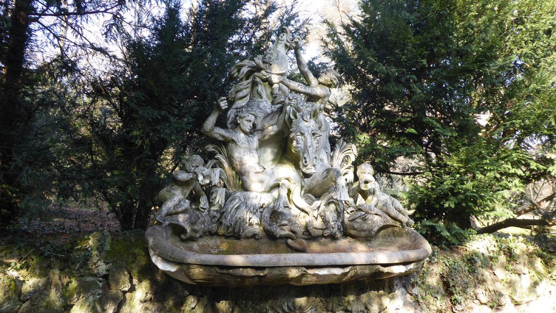 Die Figurengruppe, bestehend aus Pferden, Putten und schmückendem Beiwerk wird dem Bildhauer Gabriel Grupello zugeschrieben. Er wurde 1644 in Geraardsbergen/Belgien geboren und verstarb 1730 auf Schloß Ehrenstein bei Kerkrade. Das ursprünglich für das Schwetzinger Schloss bestimmte Kunstwerk kam im 19.Jahrhundert unter Großherzog Ludwig nach Karlsruhe. Es empfängt den Schlossgartenbesucher hinter dem Zugang zum Park an der Westseite des Schlosses. In seiner Dynamik und Detailverliebtheit markiert die vielteilige plastische Gruppe den Übergang vom Spätbarock zum Rokoko. Auftraggeber und Finanzierer derartiger Kunstwerke waren Landesfürsten, die sich mit Kunst profilieren aber auch Künstler ihres Einflussbereichs fördern und unterstützen wollten.