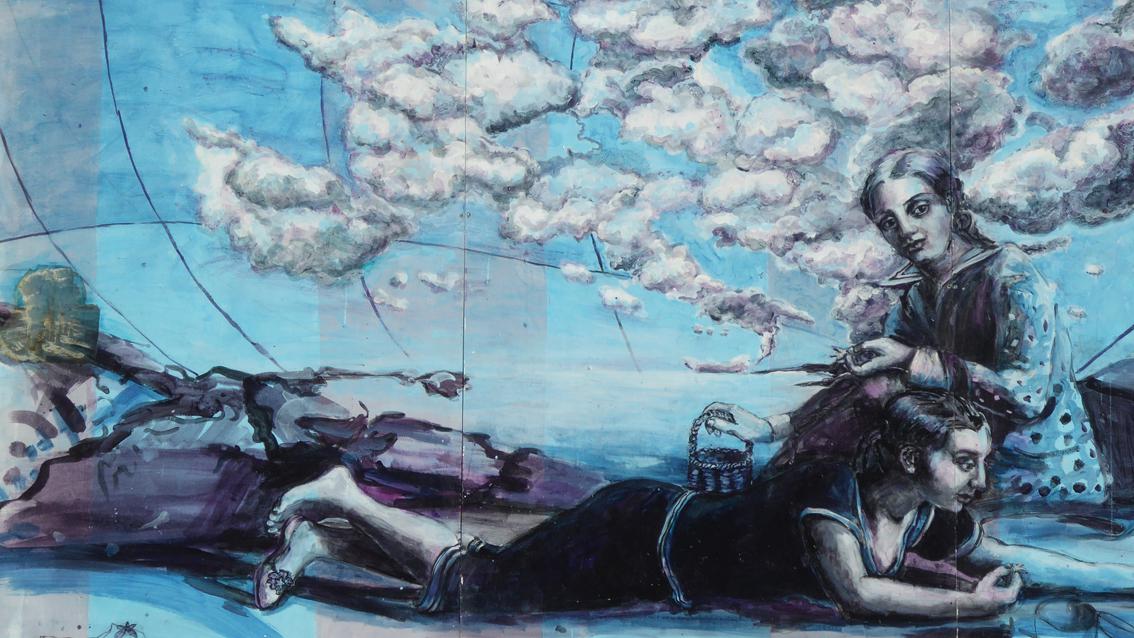 Die Malerin ist Mitglied des Künstler*innenvereins ‚PlakatWandKunst‘. Seit Jahren ist diese Gruppe in der Stadt Karlsruhe, in der Region und darüber hinaus mit temporären Aktionen im öffentlichen Raum aktiv. Verbindendes Konzept ist, dass die individuellen, künstlerischen Ideen auf Holzplatten und in dem Format 260 cm auf 360 cm verwirklicht werden. Die Träger der Raumfabrik haben Werke einzelner Künstler*innen der Gruppe in den vergangenen Jahren erworben und an verschiedenen Stellen der Gebäude des Anwesens fest installiert. Auf Eva Schäubles Bild ‚Seltsames Spiel‘ sind zwei Frauen zu sehen, deren Zusammensein gleichermaßen Nähe und Distanz ausstrahlt. Durch die vielen Nuancen der Farbe Blau ist die Begegnung am Strand unter freiem Himmel mit einer gewissen Sachlichkeit, fast Kühle hinterlegt. Die Karlsruher Künstlerin studierte zwischen 1972 und 1977 an der Staatlichen Akademie der Bildenden Künste Karlsruhe bei Prof. Hans Baschang, Prof. Peter Ackermann und Prof. Markus Lüpertz. Im Jahre 2016 wurde ihr künstlerisches Werk mit dem Kunstpreis der Stadt Baden-Baden ausgezeichnet.
