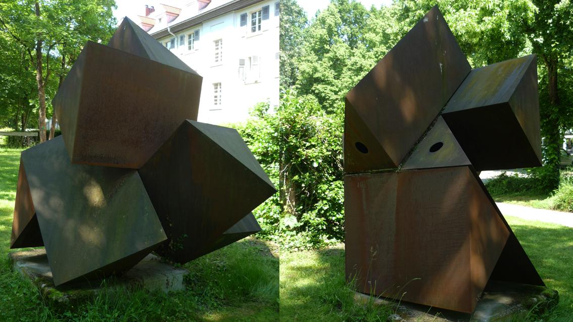 Den größten Bekanntheitsgrad haben Lederbogens Entwürfe für Briefmarken und Münzen. Seit den frühen 60er Jahren des letzten Jahrhunderts lehrte er die Grundlagen der Gestaltung an der Architekturfakultät der Technischen Hochschule Karlsruhe, dem heutigen KIT. 1969 entwickelte der Künstler, Designer und Wissenschaftler seine Skulptur aus elementaren, stereometrischen Formen. Plane Flächen, klare Linienverläufe und ein unspektakulärer Werkstoff bestimmen das Kunstwerk. Rolf Lederbogen am 4. Juni 2012 in Heidelberg.