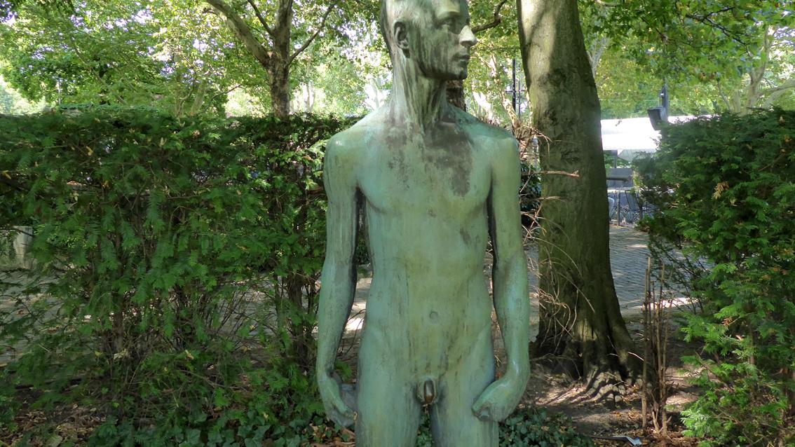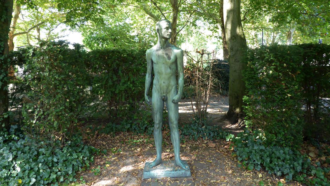 Die aufrecht stehende Figur eines nackten, jungen Mannes, dessen Blick nach links gerichtet ist und der in der rechten Hand einen Stein hält, befindet sich am westlichen Ufer des Sees, nahe der Seebühne. Der Künstler verzichtet auf einen ins Detail gehenden Naturalismus zugunsten der Darstellung einer schutzlosen Figur im Zustand körperlicher Anspannung angesichts einer möglichen Bedrohung. Tauchers Steinwerfer wurde im Jahre 1948 von der Stadt Karlsruhe angekauft und im Zoologischen Stadtgarten aufgestellt. Der Bildhauer wurde 1873 in Nürnberg geboren. Von 1900 bis 1905 war er Schüler von Hermann Volz an der Karlsruher Kunstakademie. Am 13. Januar 1950 verstarb er in Karlsruhe.