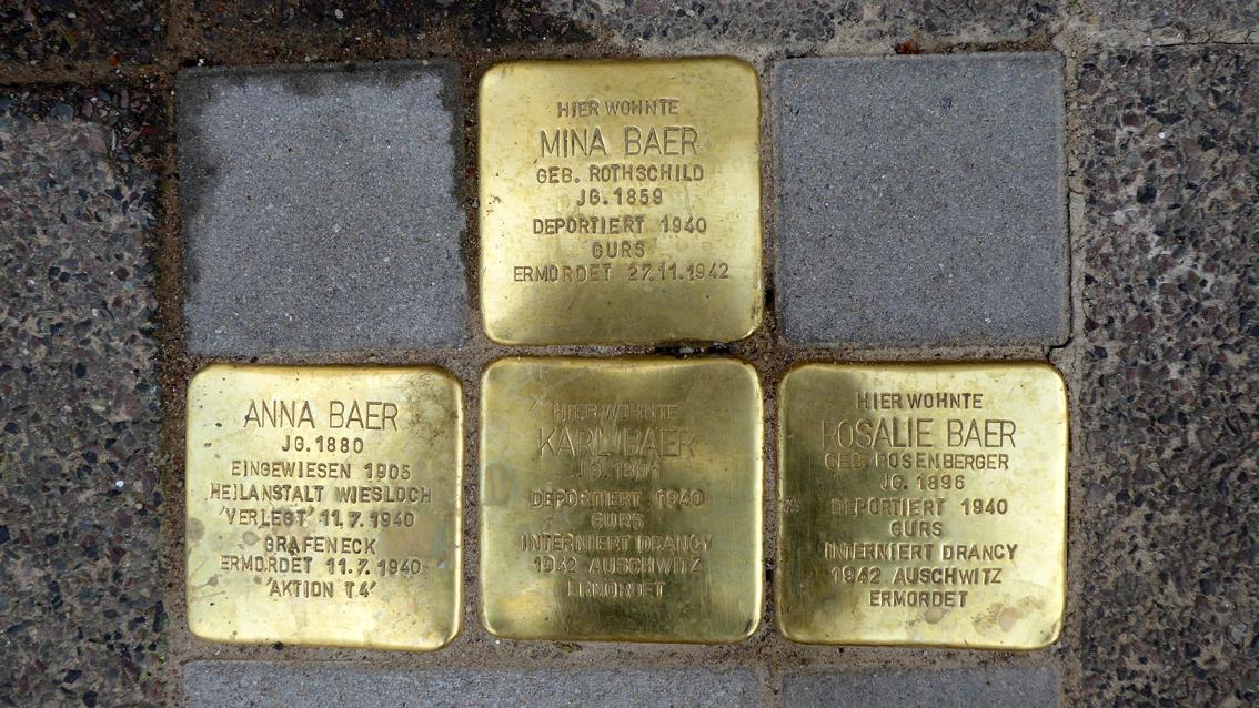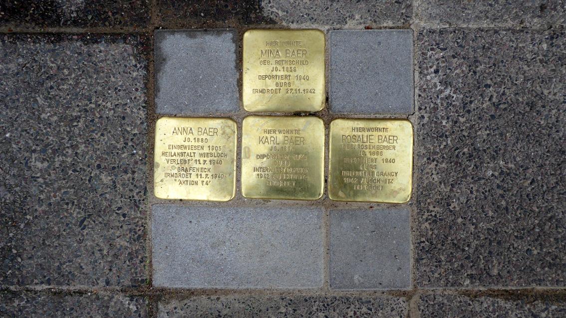 Die Stolpersteine von Gunter Demnig erinnern an Menschen, die der NS Diktatur zum Opfer fielen. Die Steine sind auf der Oberseite mit ca.9/9 cm großen Messingplatten versehen. Auf diesen sind die Namen der Opfer eingraviert. Seit 1996 verlegt der Künstler die Steine auf den Gehwegen vor den ehemaligen Wohnungen der von den Nationalsozialisten verfolgten Menschen. Mit ca.75 000 installierten Steinen in 1265 deutschen Kommunen und 24 europäischen Staaten ist Demnigs Projekt das größte dezentrale Mahnmal der Welt. In Karlsruhe gibt es über 300 Stolpersteine. Stellvertretend für diese sei hier auf die Steine in der Schnetzlerstraße 4 hingewiesen, welche die Erinnerung an Nina, Anna, Rosalie und Karl Baer wachhalten. Sie wurden von den Nazis in Auschwitz (Karl und Rosalie), in Gurs (Nina) und in Grafeneck (Anna) ermordet. Die Kosten der Stolpersteine und deren Pflege werden durch bürgerschaftlichen Einsatz getragen. Gunter Demnig wurde am 27. Oktober 1947 in Berlin geboren. Seine Ausbildung erfuhr er an der Hochschule für Bildende Künste Berlin, an der Kunsthochschule sowie an der Universität in Kassel. Er lebt und arbeitet in Elbenrod in Hessen. Der folgende Link verweist auf ausführliche Informationen über die Stolpersteine in Karlsruhe.