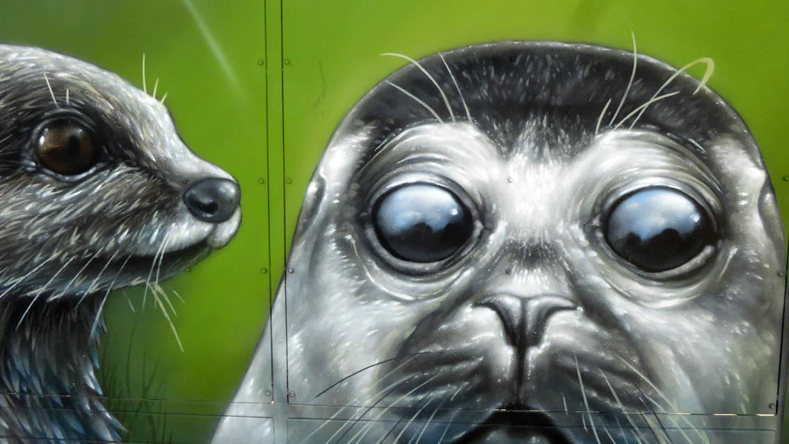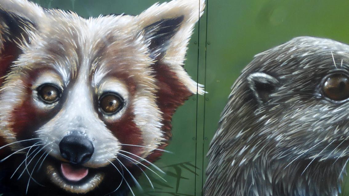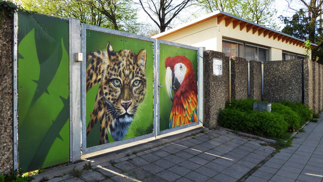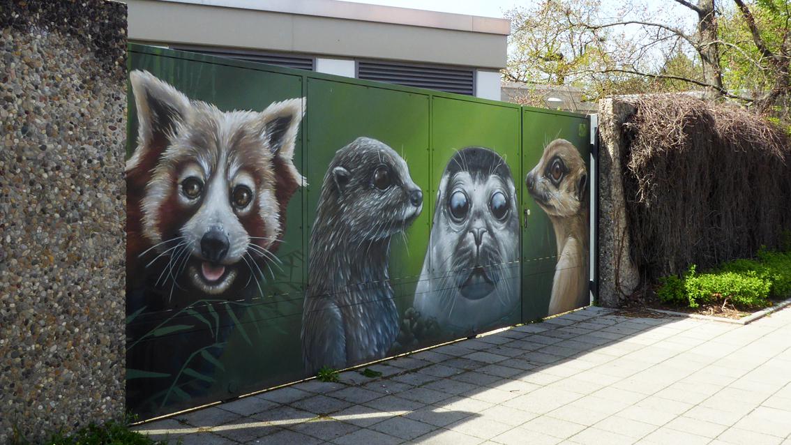 Seit 2018 befinden sich Werke des Karlsruher Street Art Künstlers Sven R., der sich auch WUAM (WorldNeedColors) nennt, auf zwei Außentoren des Zoologischen Stadtgartens entlang der Ettlinger Straße auf Höhe der Straßenbahnhaltestelle Augartenstraße. Roter Panda, Seehund, Erdmännchen, Papagei und Leopard nehmen als Monumentalbildnisse mit großen Augen Kontakt auf mit den in Richtung Bahnhof bzw. Innenstadt vorbei Flanierenden. Die Tierporträts sind in Airbrush Technik auf den mattgrünen Hintergrund der Stahltore gesprüht.