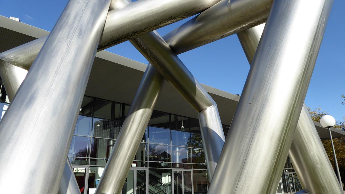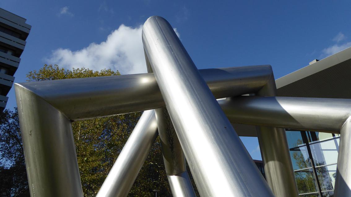 Bei der ‚Triade‘ des emeritierten Professors und ehemaligen Leiters der Technischen Mechanik an der Fakultät für Maschinenbau am KIT durchdringen sich drei Rahmen aus hochglanzpolierten Edelstahlrohren. Die auf der Grundlage einer mathematischen Formel geschaffene Plastik symbolisiert zeichenhaft die Verbindung von Technik, Mathematik und Kunst.