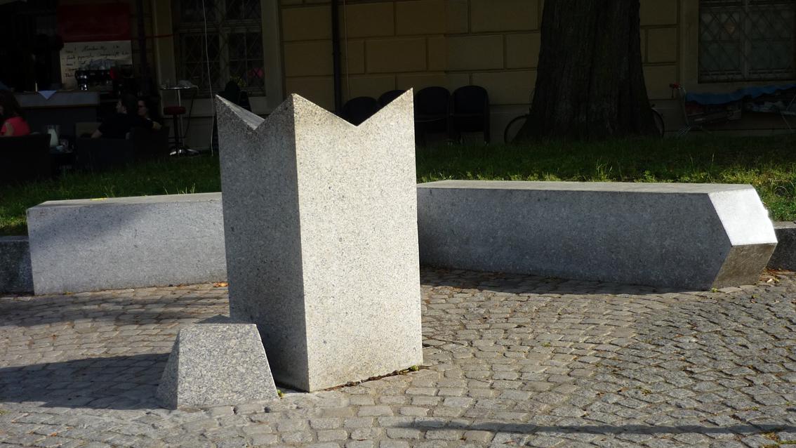 Die Gesamtanlage des Ulmer Bildhauers besteht aus vier Teilen. Der Hauptstein, der auch als Trinkwasserspender dient, ist plastisch am differenziertesten durchgearbeitet, die Nebensteine sind als Sitzflächen nutzbar. Die Gestaltung lässt sich auf stereometrische Grundformen zurückführen. Das Ensemble ist bestimmt von klaren Flächen und geraden Linien, die bei Sonnenlicht eine ausgeprägte Schattenwirkung entfalten.