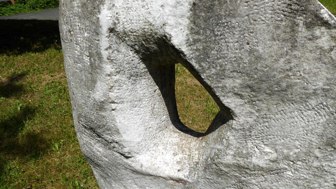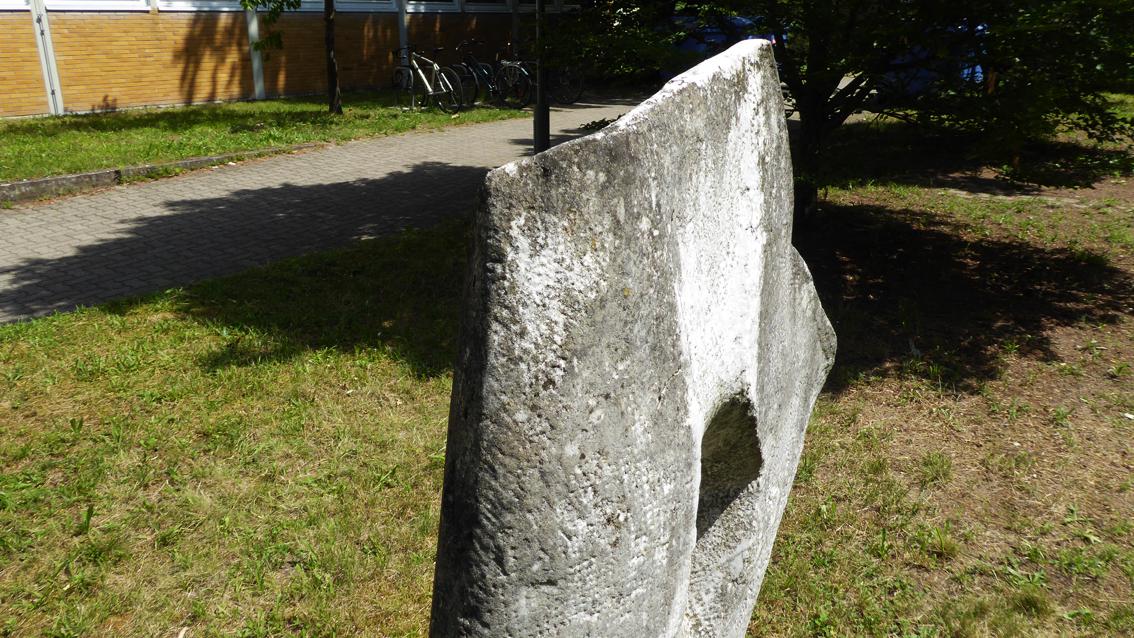 Die Skulptur, die sich im Innenhof des Engler-Bunte-Instituts befindet, umkreist das Thema ‚Vereinigung‘. Der Kalkstein wurde in einer elementaren Bildsprache bearbeitet, die in der Tradition abstrakter Plastik steht. Die Bildhauerin wurde 1928 in Dresden geboren. Ebendort studierte sie Bildhauerei an der Hochschule für Bildende Künste. Ihr bekanntestes Werk mit dem Titel ‚sich befreien‘, entstand 1987 aus Carrara Marmor und wurde 1990 im Palaisgarten in Dresden installiert. Charlotte Sommer-Landgraf verstarb im Jahre 2006 in ihrer Heimatstadt.