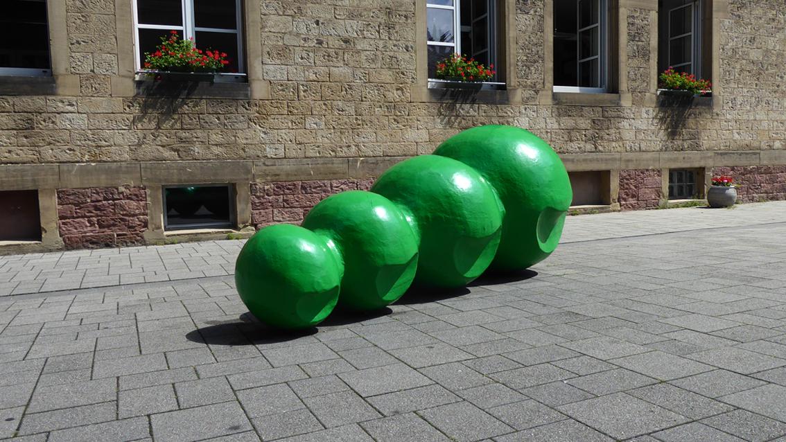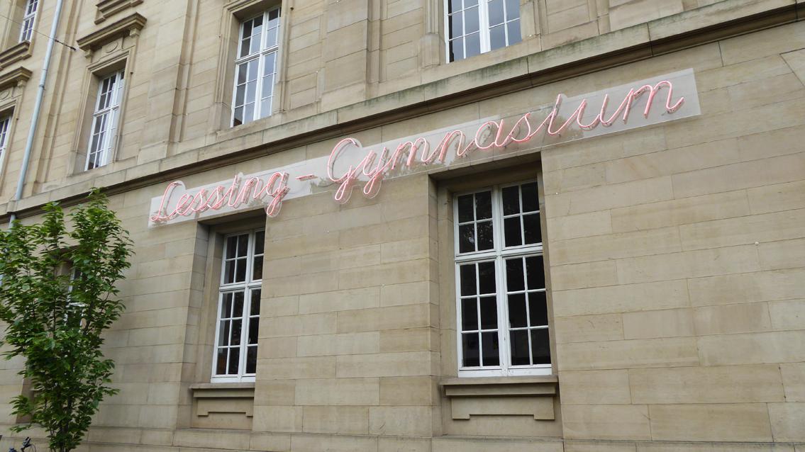 Das bestimmende bildnerische Mittel von Antoanetta Marinov ist die künstlerische Installation. Ihre Interventionen im Innen- und Außenbereich des Lessing-Gymnasiums sind künstlerische Antworten auf den Ort und dessen Nutzung. Der Titel der dreiteiligen Arbeit lautet ‚Vom Alten ins Neue, vom Neuen ins Alte‘. Im Innenbereich des Neubaus verweisen zwei nachgebaute Holztüren (je ca. 210/100/20 cm) auf den Bestandbau, für den neu gestalteten Hof fertigte sie ein leuchtend grünes Objekt aus Kunststoff an (ca. 120/300/120 cm). Als Vorlage diente ein Fragment einer nicht mehr vorhandenen Wandmalerei im Ruheraum des Altbaus. An der Außenfassade brachte die Künstlerin in einem leuchtenden Rosa den Schriftzug ‚Lessing-Gymnasium‘ an (ca. 50/500/5 cm). Antoanetta Marinov studierte von 2001 bis 2007 an der Staatlichen Akademie der Bildenden Künste Karlsruhe bei Prof. Ernst Caramelle, Prof. Leni Hoffmann und Prof. Silvia Bächli, bei der sie im Jahre 2007 Meisterschülerin war.