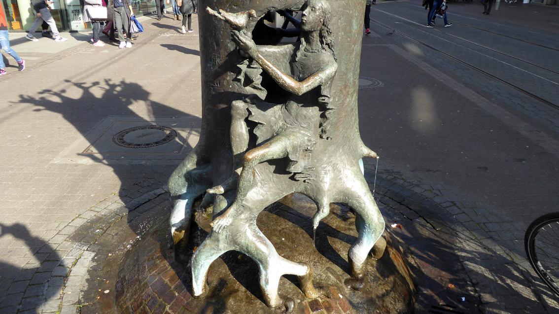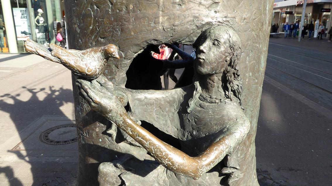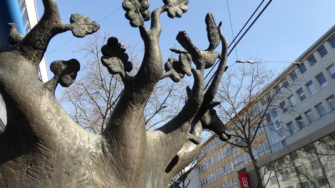Der Bildhauer studierte unter anderem an der Universität der Künste Berlin bei Bernhard Heiliger, dessen Meisterschüler er 1969 wurde. 1971 entwarf Nuss das Kopfrelief des ehemaligen Bundespräsidenten Theodor Heuss für das Zwei-Mark-Stück. Auf einem gepflasterten Kugelsegment Ecke Kaiser-/Waldstraße befindet sich ein stilisierter Baum, dem Figuren und Tiere entwachsen. Der Künstler wählte für seine Deutung von Brunnen, Wald und Fabelwesen eine den Gegenstand vereinfachende Bildsprache.