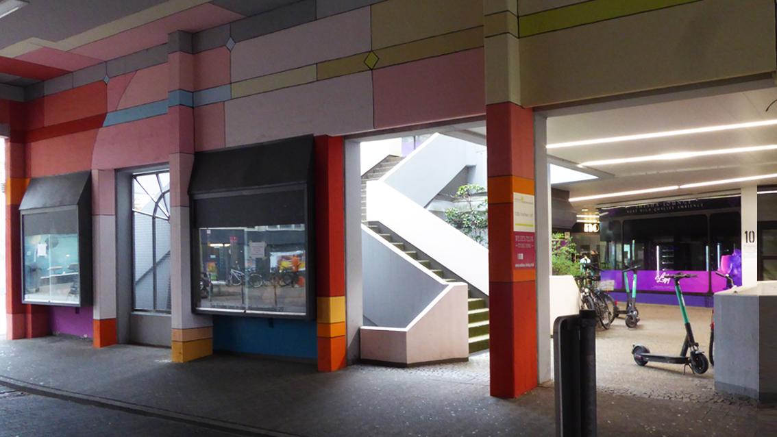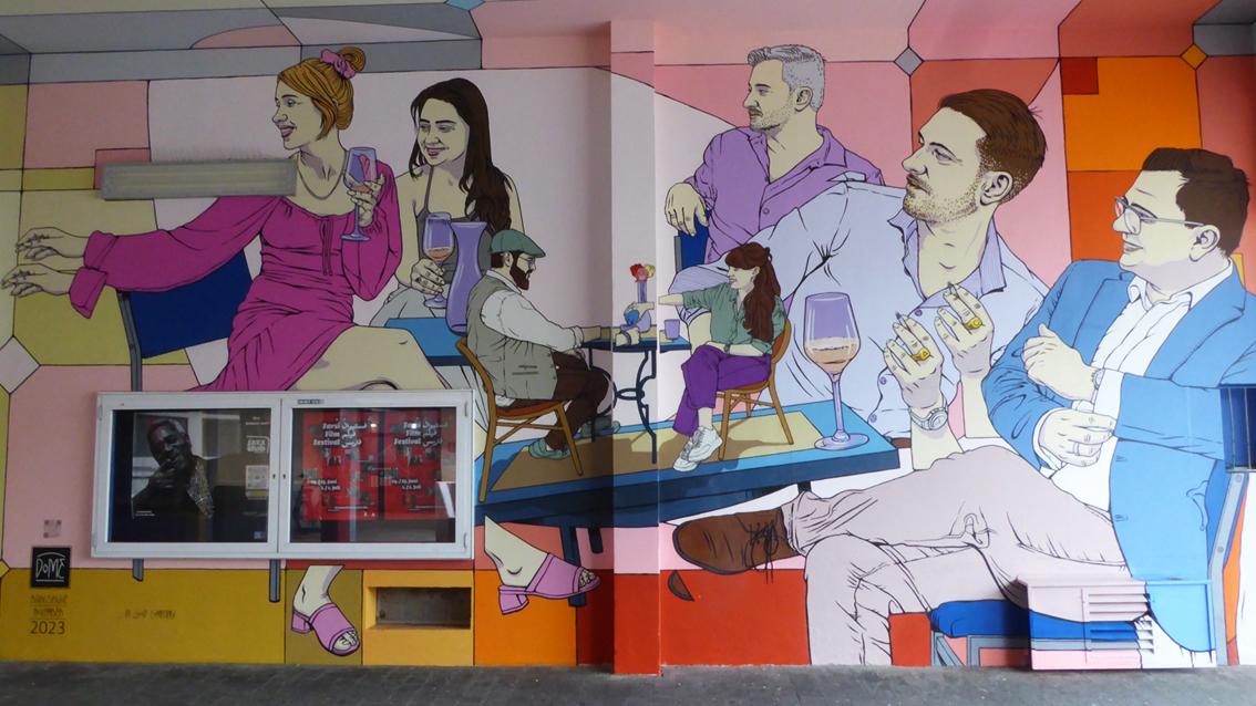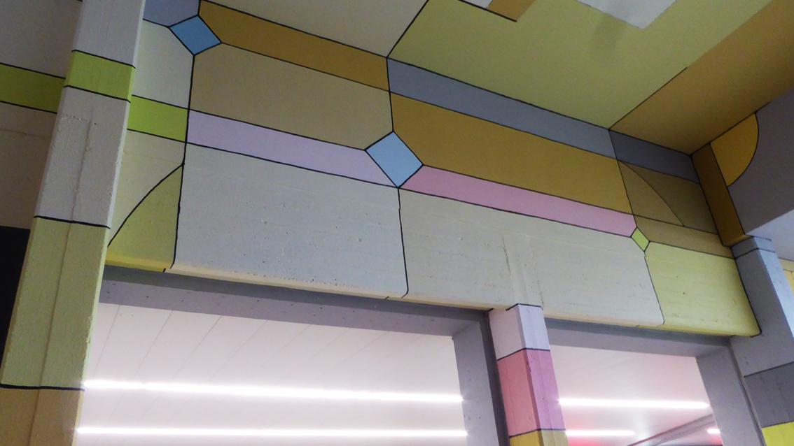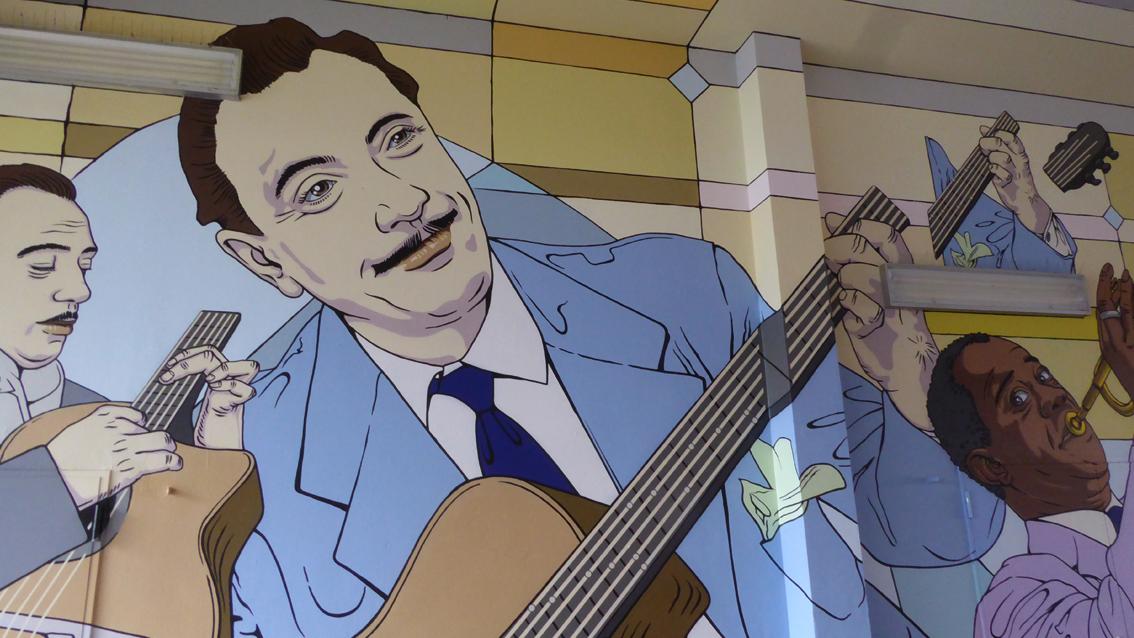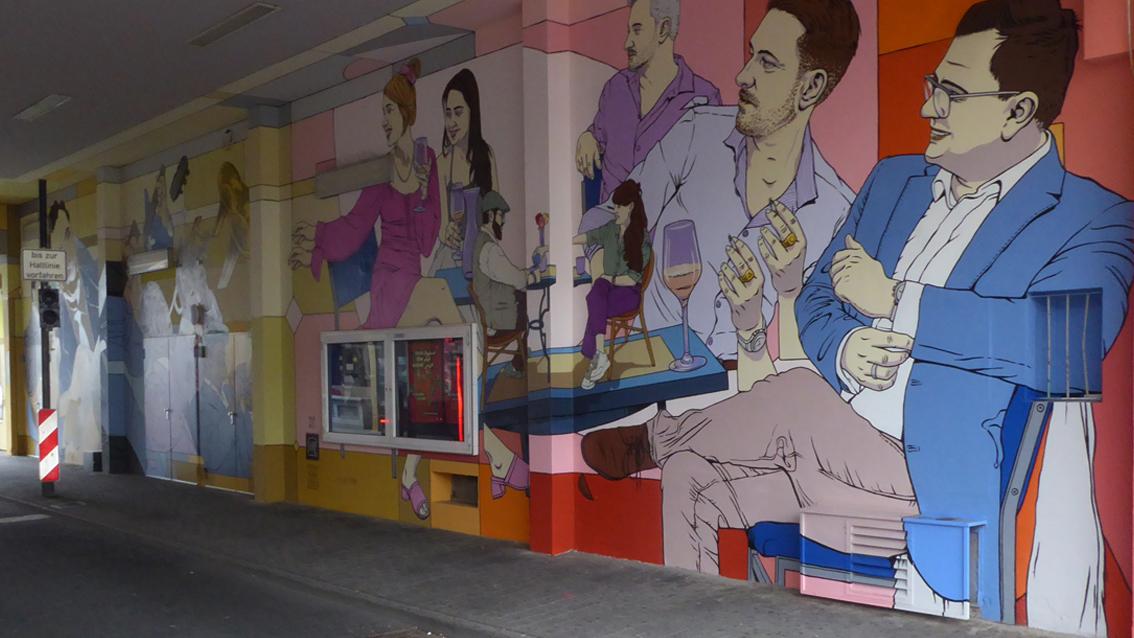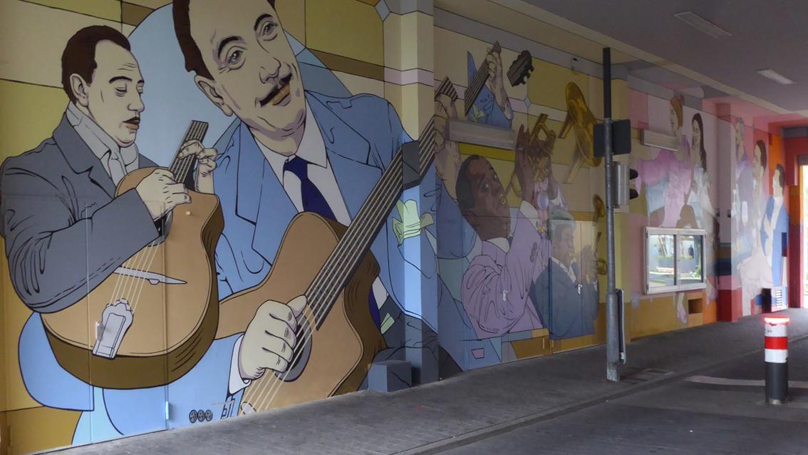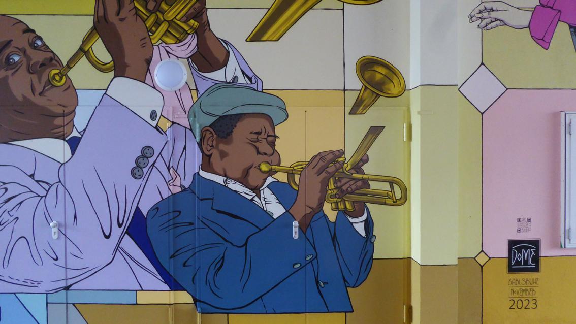 Um der Tristesse der überdachten Passage auf Höhe der Kinemathek entgegen zu wirken, wurde ein Kunstwettbewerb für diesen unwirtlichen Ort ausgelobt. Diesen gewann Dome alias Christian Krämer, der im öffentlichen Raum in Karlsruhe bereits mehrfach vertreten ist. Die zur Realisierung benötigten Mittel stammen aus dem Fördertopf: „Zukunftsfähige Innenstädte und Zentren“. Die südliche Wand zeigt Männer und Frauen, die bei einem Drink entspannt den Musikern zuhören. Der Trompeter erinnert an Louis Armstrong, der Gitarrist an Django Reinhardt, beide prägten zu ihren Lebzeiten entscheidend die Welt des Jazz. Die Szene insgesamt verweist auf den Jazzclub, dessen Räume sich direkt hinter der bemalten Wand befinden. Auf der nördlichen Wand und an der Decke befinden sich keine Figuren. Durch Linien unterteilt, entstanden dort unterschiedlich große Felder. Diese sind mit Farben ausgemalt, die auf der erzählerischen Gegenwand verarbeitet wurden.