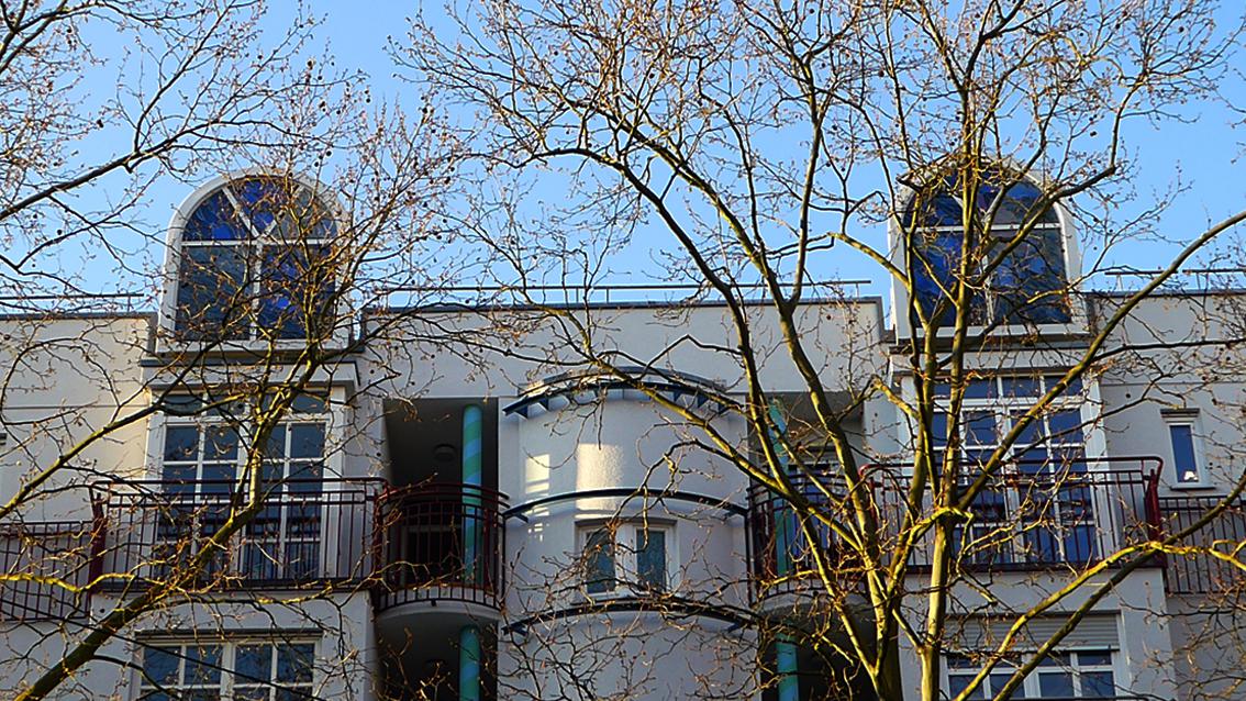 Das Künstlerpaar Barbara Jäger und OMI Riesterer entwarf und verwirklichte zwischen 1983 und 1986 zwei Blendfenster, die einen Wohnblock in der Mathystraße bekrönen. In einem additiven Verfahren sind Glasfragmente aus mehr Blau- und weniger Rottönen zu einer auf den ersten Blick ungegenständlichen Komposition gefügt. Beim genauen Hinsehen lassen Farbe, Form und Zuordnung der Gläser an Gefieder von Vögeln, an Schuppen von Fischen oder an kleine Wellen denken. Barbara Jäger studierte von 1966 bis 1970 an der Staatlichen Akademie der Bildenden Künste Karlsruhe, OMI Riesterer absolvierte von 1968 bis 1977 ein Architekturstudium an der damaligen Technischen Hochschule Karlsruhe (heute KIT). Die beiden arbeiten seit 1970 zusammen.