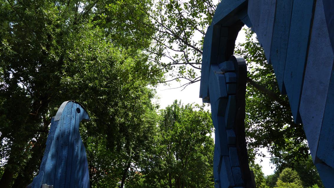 Auf dem Skulpturenpfad zwischen Grünwettersbach und Palmbach befinden sich zwei großformatige Vogelreliefs, die der Künstler zu einer den Ort prägenden, skulpturalen Installation fügte. Einfache Formen und unspektakuläre Farben verbinden sich im Einklang mit der Natur zu einem zeichenhaften und ausdruckstarken Kunstwerk. Die Arbeit 'Zwei Vögel' wurde um 1998 entworfen, war einige Jahre in Privatbesitz, bis sie 2009 im Skulpturenpark aufgestellt wurde. Georg Schalla wurde im Jahre 1947 in Müncheln/Geiseltal (Sachsen-Anhalt) geboren. Nach einer Ausbildung zum Schriftenmaler und Lackierer arbeitete er einige Jahre als Theatermaler am Badischen Staatstheater Karlsruhe. Zwischen 1970 und 1977 studierte er an der Staatlichen Akademie der Bildenden Künste Karlsruhe.